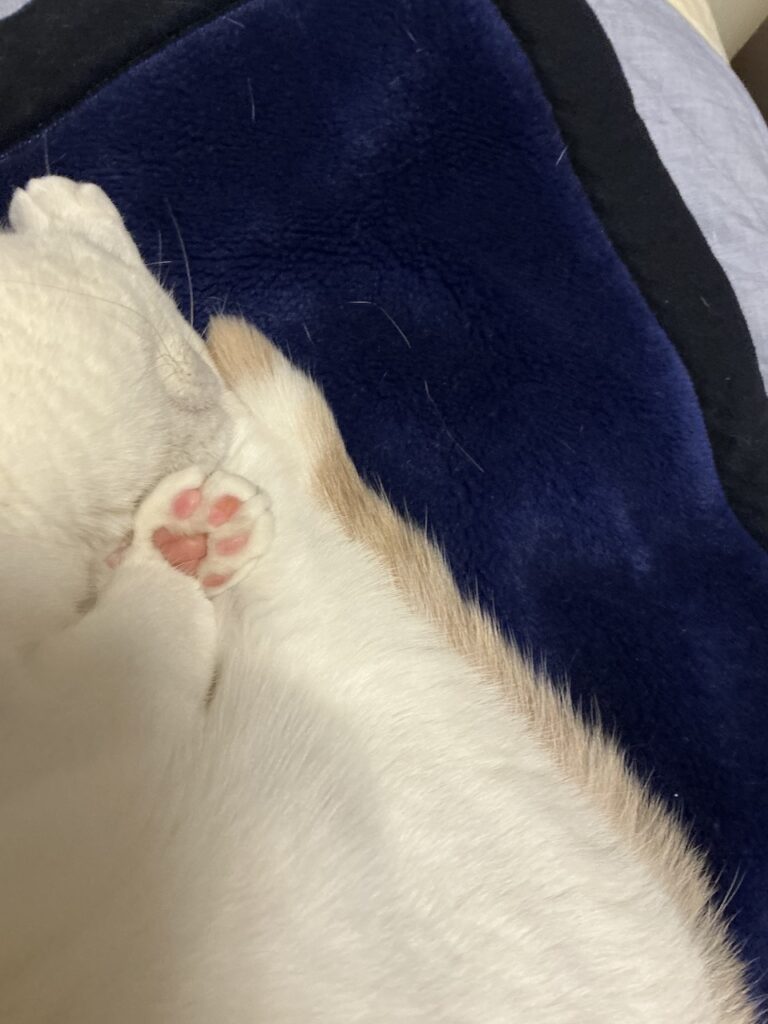 2026.02.16 猫 花咲く肉球と、布団ジャックな午後 manmaru-neko 今日もベッドを占拠です。 花模様の奇跡 まるで小さな花が咲いたかのようなピンクの肉球。白い毛並みに映える淡い色合いが、映えています。思わず見惚れるね。 ど真ん中宣言 布団の中央を堂々と占拠。完全に主従逆転です。まるちゃんに遠慮という言葉はない…。 無防備という信頼 足を伸ばし、お腹をゆるめたままぐっすり。無防備なポーズは、家猫の証だね。。 白と紺のコントラスト ふわふわの白い毛並みと布団のコントラストがきれいだね。ピンク肉球が良いアクセント。 布団を譲る幸せ まるちゃん、くーくー寝息を立てています。布団は奪われたけど、こんな時もあるよね。癒やし時間です。 まる ABOUT ME まる支配人2018年生まれ、7歳。 スコティッシュフォールド、♀。 食べることと寝ることが、なりより楽しみ。 好きなおやつは「クエール(うずら)」だよ。